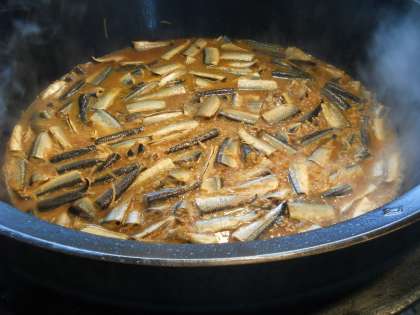 “さんまのかわり煮”は,しょうがをごま油で炒めて,赤みそ・三温糖・料理酒・トウバンジャン・しょうゆ・酢を加えて煮汁を作り,さんまを入れて煮含めました。味がよくしみていて,骨までやわらかく子どもたちには,好評でした。