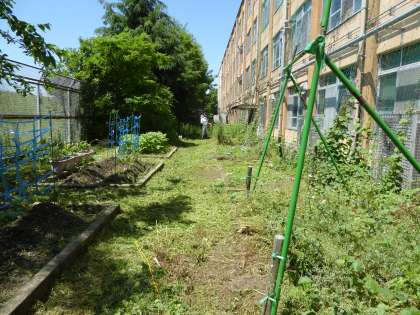 緑豊かな美豆小学校ですが,学校園では,植物の勢いが勝り境界線が見えにくくなっていました。管理用務員さんによって,除草がおこなわれ,広大な学校園がみるみるもとの姿をとりもどしました。