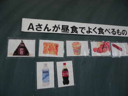 「Aさんの食事は塩分が多いな〜!」,「カロリーが高そう!」,「野菜が少ない!」など感じたことをもとに,じゃあ自分ならどんな食事にするのかと,提示された食品の中からいくつかのメニューを選びだし,バランスの良い食事を考えていきました。