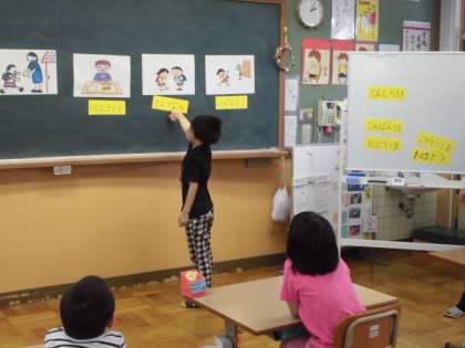 どんなあいさつを知っているか,絵とあいさつをつなげる活動をしました。