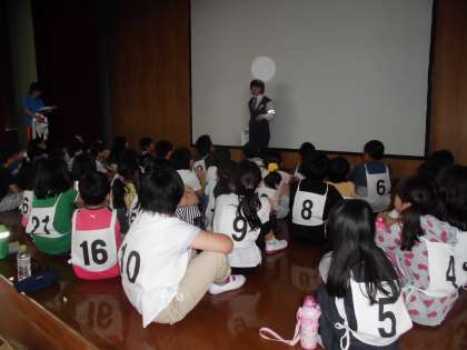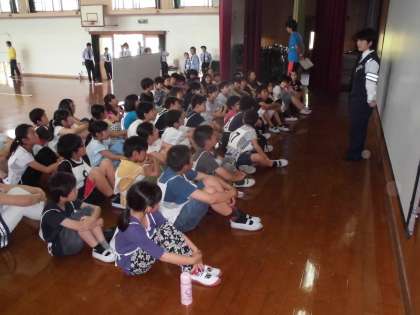 最初に全体会で,基本的な交通ルールや準備姿勢,ブレーキの正しいかけ方などの説明を受けました。昨年も受講している自転車教室ですが,子どもたちは随分緊張した様子でした。