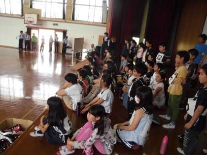 コース説明を受けた後,警察官の方による見本走行を見学しました。難易度の高いジグザグ走行や遅乗り走行をスムーズにこなされている姿に,子どもたちから「おー!」「すごいわ〜」と,どよめきが起こっていました。