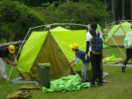 今晩一晩ですが、大事な「すみか」づくりです。自分たちの秘密基地を作るようなわくわく感を持って、協力してテントをたてました。