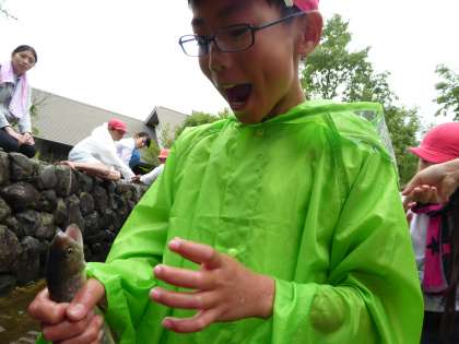 朝ごはんの後は、魚つかみ体験です。