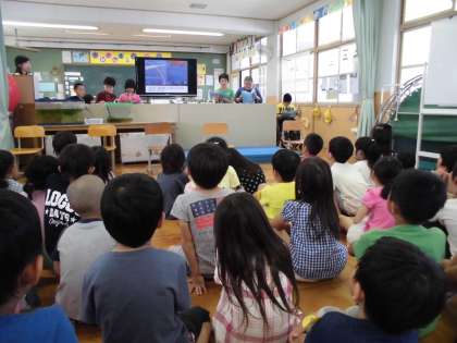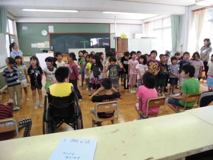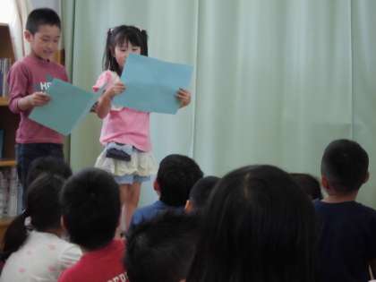 1年生からは代表の子が自己紹介をした後,「ともだちになろうよ」の歌のプレゼントをしました。
