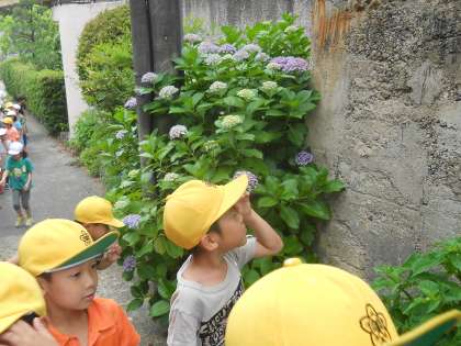 このあたりのお家は,お花や野菜を育てている方が多いようで,いろんな種類のアジサイを見つけたり,キュウリやトマト,スイカなどの野菜も見つけることができました。