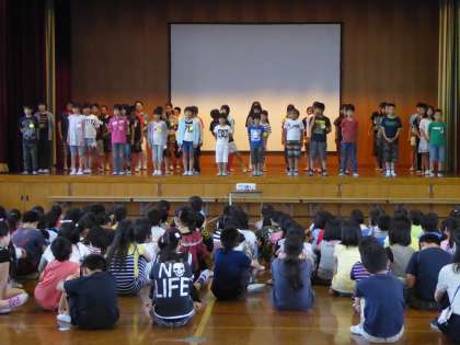 6年生はまどみちおさんの「せんねんまんねん」を群読で発表しました。