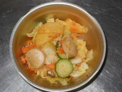 “ソーセージと野菜のいためナムル”は,油で揚げたチキンフランクとじゃがいもを,にんじん・キャベツ・きゅうりといっしょに炒め,さとう・しょうゆ・酢で味つけし,最後にすりごまを加えました。さっぱりとしていて,子どもたちは食べやすかったようです。