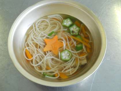 七夕の行事献立でした。七夕にまつわる食べ物としては,昔からそうめんをお供えしたり,食べたりしていました。給食では“七夕そうめん”を天の川に見立てたそうめんと星に見立てたオクラとにんじんを入れて作りました。