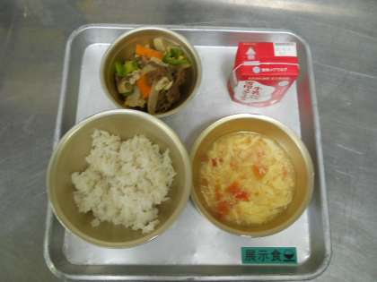 7月7日の献立は,「麦ごはん・牛乳・焼肉・トマトと卵のスープ」でした。