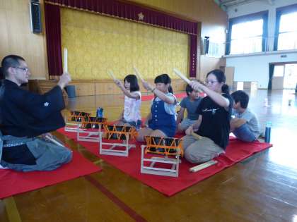 最初に鼓や太鼓の特徴や扱い方について詳しく説明していただきました。その後4つのブースに分かれて先生に教えていただきながら体験しました。持ち方やたたき方や声の出し方など細かく教えていただきました。真剣な表情で練習するうちに自然と子どもたちの背筋が伸びてきます。