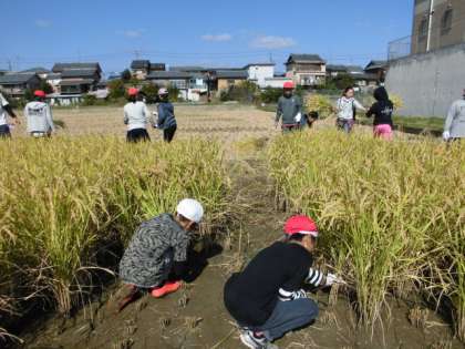 今日は地域の方に教えていただきながら,稲刈りをしました。