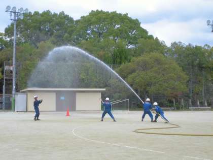 最後に運動場で淀消防分団による放水訓練の様子を見学しました。勢いよく射出する水ときびきびとした分団員の方々の姿に頼もしさを感じました。