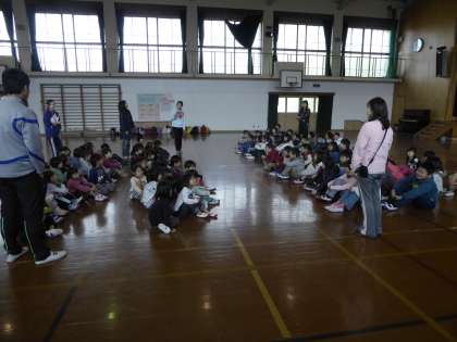 つぼみ保育園の4,5歳児さんが美豆小に来てくれました。歌やゲームで楽しく交流しました。2年生は,運動会で取り組んだレッツナルコを披露しました。最後は笑顔で「また会おうね」と挨拶して会を終えました。
