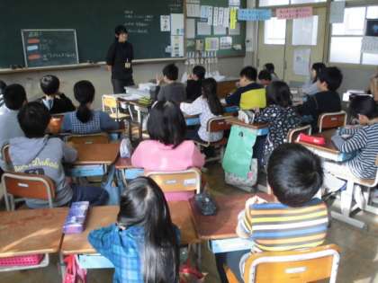 マット運動の発表会を終え,教室で振り返りをしているところです。限られた練習時間の中で,よい技を見せることができたという感想が多く聞かれました。