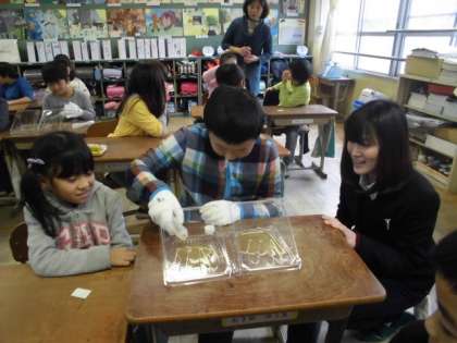 かぜやインフルエンザのシーズンを前に、3年生が手洗いの学習をしました。大橋辺にある日研生物医学研究所から3名の方が来られて、寒天培地を使い、手にどれだけの細菌がついているか、手洗いをした後はどうなっているかなどがわかる実験をしました。