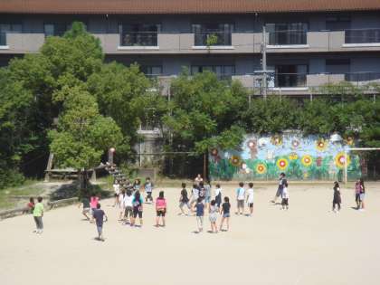 今日の2組のみんな遊びはバレーボールです。朝は涼しく過ごしやすい環境でしたが,中間休みの時間帯には気温も上がり,とても暑かったです。そんな中でもほとんどの子どもが外へ出て遊んでいました。
