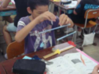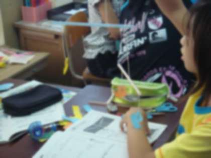 てことつり合いの学習のまとめとして,つり合いを利用したおもちゃ作りを行いました。今日作ったのは「モビール」と「さおばかり」です。最初のモビールを作るのに思った以上に時間がかかり,子どもたちは大苦戦!支点を動かしながらつり合いをとっていくのですが,少し動かすだけで大きく傾いてしまうので,あっちへ傾き…こっちへ傾き…「もう出来ひん!!」と叫ぶ子がたくさんいました。しかし苦労した分,つり合った時はものすごく嬉しそうな顔をしていました。自分たちの身の回りにもてこやつり合いを利用したものがあるということに,これからもどんどん気づいていってほしいと思います。