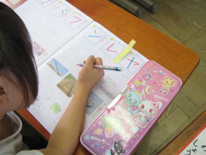 ひらがなに引き続き,漢字と同時進行でカタカナを進めています。子どもたちはとめ,はね,はらいに気をつけて丁寧に書いています。毎日新しい字を習うのを楽しみに,「きょうはトや!」「きょうはカや!」と,すごく興味をもって学習に取り組んでいます。