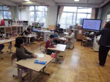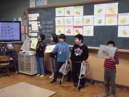 「英語で話そう」という単元で,食べ物や生き物の英語での言い方を確かめたり,英語でビンゴゲームをしたりしました。はじめ,「英語はむずかしそうだ。」と心配していた子どもも,「アップル。」「オレンジ。」などと話しているうちに,笑顔が一杯出るようになり,最後には「英語って楽しいなあ。」と話していました。