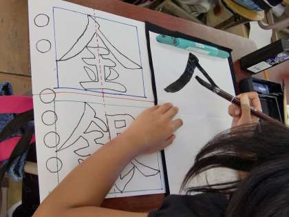 「金銀」の練習を1時間しました。与えられた半紙は,一人4枚です。まず,1枚目は,こちらからの説明を一切受けず,自分なりにお手本を観察し,直感で書きます。後に教師の書くときのポイントを聞き,2枚目以降は,できることから自分で実践します。普段は使用しない毛筆という筆記具では,思ったように書くことができません。「なぜ,わざわざ筆で書くの?」といった質問をよく受けます。それは,ゆっくり運筆できるからです。ゆっくり書くことで正しい字形の軌跡を追えるのでは!?