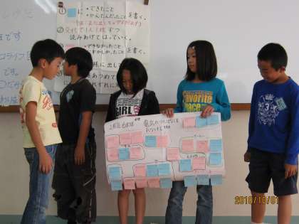 気候ネットワークから来ていただいた方々に,ありがたいエコについてのお話をしてもらいました。子どもたちはこれまでも,エコについて学習してきましたが今日は改めて自分の生活を振り返り,これからの「エコライフ目標」を立てました。グループワークで模造紙に,「エコでできたこと」「エコでできなかったこと」を書いた付せん紙を貼っていきます。それをグループごとに分類し,今後の目標について考えいきました。初めての方法で,難しかったのですが,子どもたちは真剣に一生懸命頑張りました。