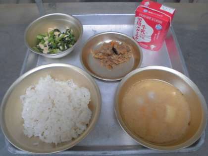 5月11日の献立は,「麦ごはん・牛乳・さばそぼろ丼(具)・小松菜とゆばの煮びたし・いものこ汁」でした。