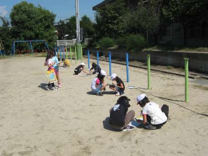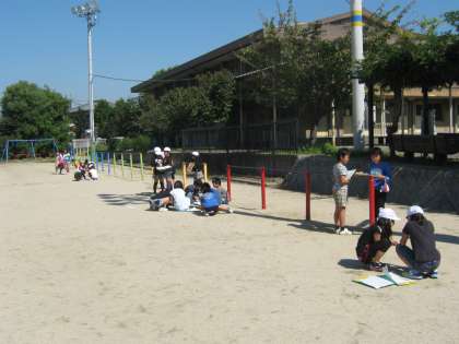 絶好の実験日和でした。子どもたちは,1時間ごとに,方位磁針を持って同じ場所で太陽の動きを観察しました。「時間がかわれば,かげや太陽の向きが変わるのか」という実験をみんな一生懸命調べていました。結果は…影の向きがかわったよ,太陽が動いているからなんだ!!ということに気付いた子どもたちは,とても満足そうでした。
