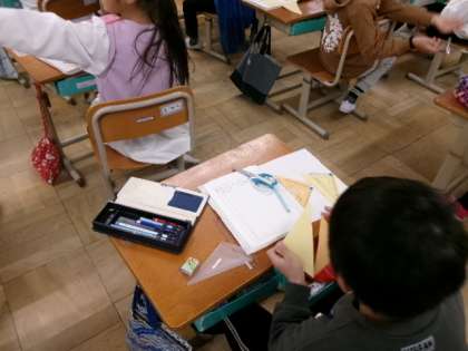 今日は長方形や正方形を切ってできる形を調べました。頂点と頂点を結んだ線つまり対角線に沿って切ると直角三角形ができるということに気づいてほしいですね。このあとは、直角三角形を見つける。方眼紙のめもりに沿って直角三角形をかく。ということになっていきます。