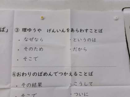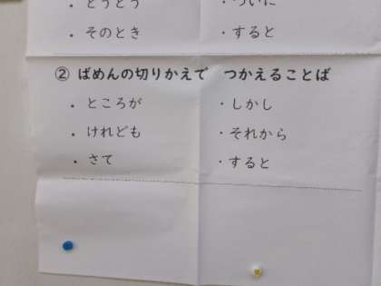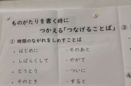 おはなしづくりの時には、写真のようなことばを大切にしています。これは学校だけでなくご家庭でも意識していただくと力が伸びてきます。