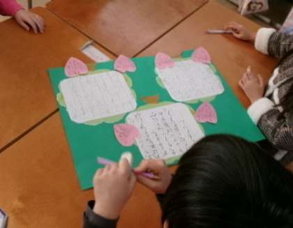 今日は、これまでに一人ひとりが読んだ本の紹介をした台紙に一人ひとりがメッセージを書きました。書くときは相手のことを考えないといけません。こういう活動は、レポート作成やプレゼン作成につながっていきます。