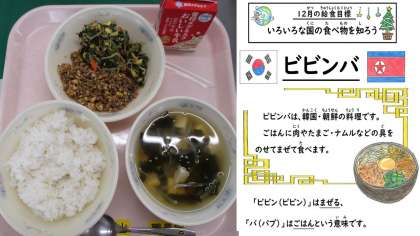今日の献立は、ごはん・牛乳・ビビンバ(具)肉と卵・ビビンバ(具)ナムル・わかめスープです。韓国・朝鮮の料理です。ごはんに混ぜて食べるととても美味しいです。子どもたちから「2学期ありがとうございました。今日もおいしかったです。」と嬉しい言葉をかけてもらいました。 3学期は1月7日から給食も始まります。『早ね・早起き・朝ごはん』で冬休みも元気に過ごしてほしいと思います。