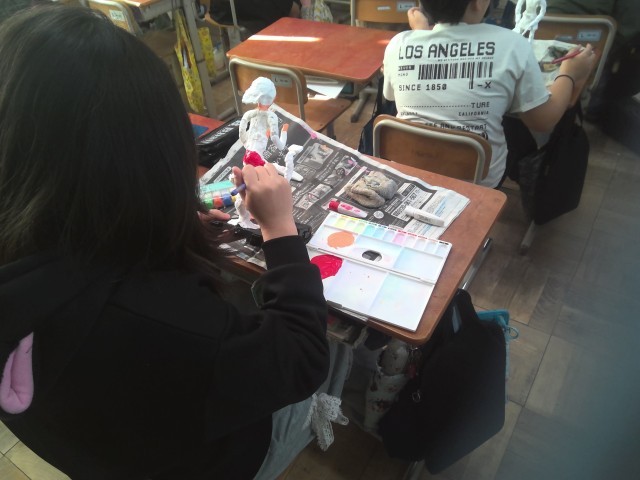 未来の自分を紙粘土で制作しています。今日は絵の具で色をつけました。料理人やスポーツ選手など、様々です。