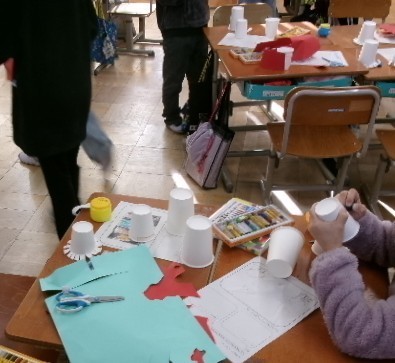 今日は、紙コップを使って、とびだすしくみをつくりました。とびだすようすからいろいろなデザインを考えていきます。