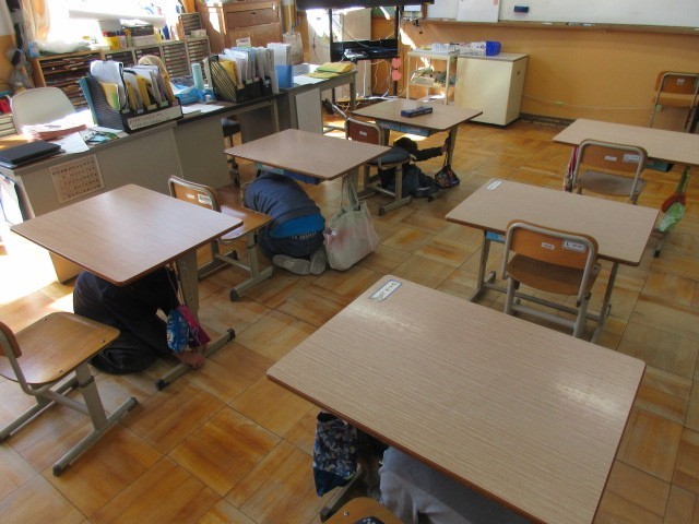 みんな真剣に机の下に避難し、次の放送を聞いていました。