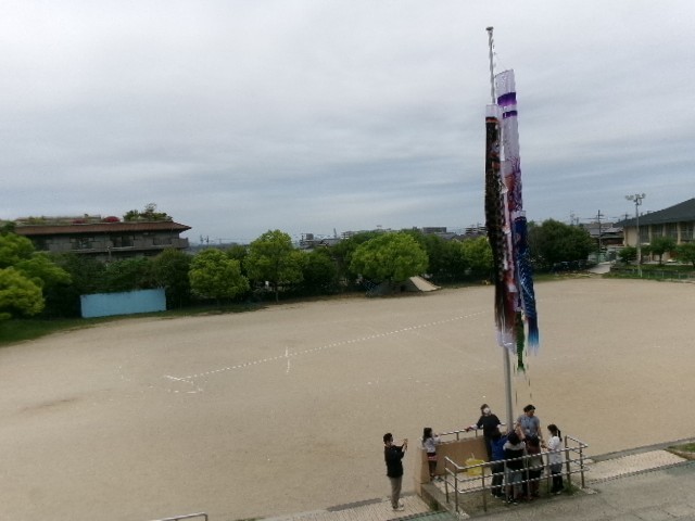 学校のこいのぼりの様子です。風に揺られることはありませんでしたが、今年度新たにデビューしたとても大きなこいのぼりです。