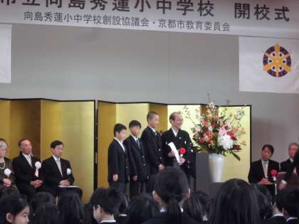 学校長の開校宣言の後は,京都市長,京都市会議長からの祝辞をいただきました。また,向島秀蓮創設協議会の方からのごあいさつや,市長からの感謝状贈呈がありました。