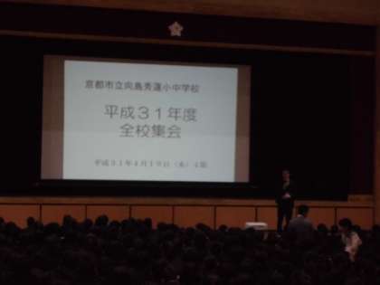 学校長から,教職員を紹介した後に,向島秀蓮小中学校をどんな学校にしていきたいかを1〜9年生の前で話をされました。
