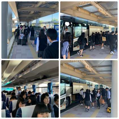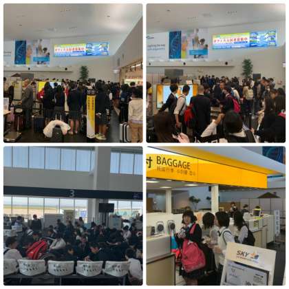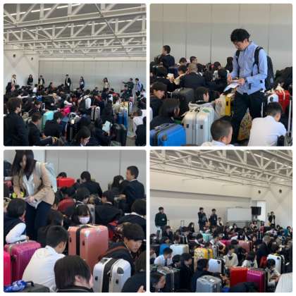 先ほど無事那覇についたとの連絡が入りました。写真は,バスで神戸空港に到着し,空港でフライトを待つ時間の様子です。初めて飛行機に乗る生徒もいるかもしれません。