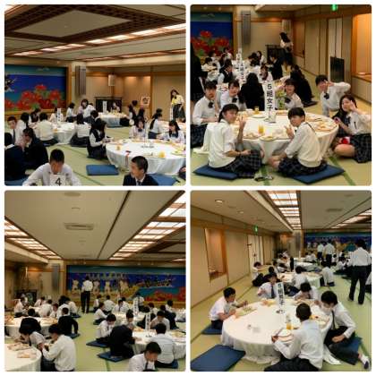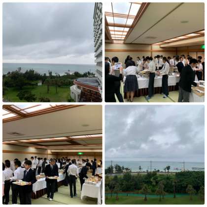 おはようございます。修学旅行3日目,沖縄の朝の海の風景と朝食の様子の写真が届きました。沖縄は雨のようです。止んでくれるといいのですが…。朝食の様子からは少し疲れれているように感じる男子と,それでも元気な女子と・・・といった感じがうかがえます。今日は首里城と国際通りでの研修の後,帰路につくといった予定です。落とし物や忘れ物がないように最後の1日を楽しんでください。