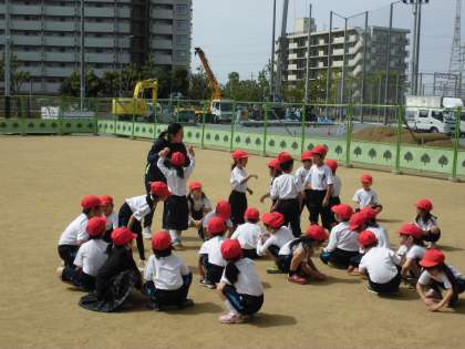 それは1年生の体育に,9年生の授業がない後期課程の体育科の先生が指導に来てくれたのです。担任と一緒に「ころがしドッジ」の学習をしました。