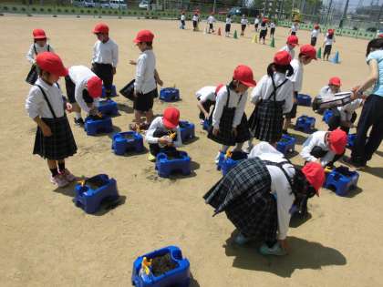 今日は1年生が生活科の学習で,植木鉢に「アサガオ」の種をまきました。これから芽が出て,花が咲いていく様子を観察していきます。