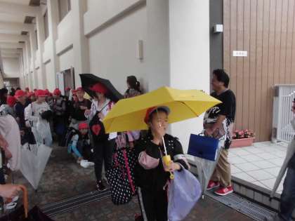 出発式では校長先生から「残念ながら雨,と思うのでなく,雨でも楽しめるようにいろいろな活動をしましょう」というお話がありました。