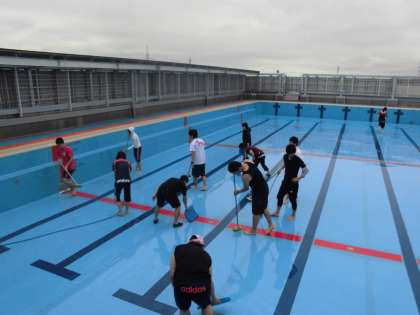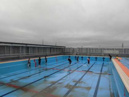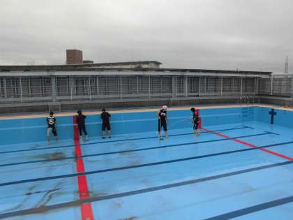5階にあり,新しいプールですが,やはり循環や濾過をしていなかったので,汚れています。壁の黒ずみをこすったり,プールの底をこすったり,プールサイドの汚れを取ったり。