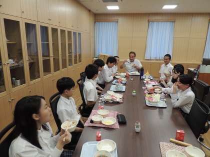 本日3日(水),昼食の時間に校長室におきまして,生徒会本部役員との「ランチミーティング」を行いました。夏休みに行われます「ふれあいトーク」や10月に実施されます「秀蓮フェスティバル」などの意見交換を行いました。よりよい学校になるようにみんなで一致団結してがんばっていきましょう!