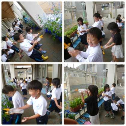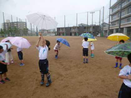 生活科「みんなであそぼう なつ」の学習で,雨の日の様子を調べました。傘をさし,広い運動場へ出て,雨の音を聞いたり,植物や鉄棒など色々なところについている雫をじっくり見たりしました。最後は朝顔にたっぷり水やりもできました。