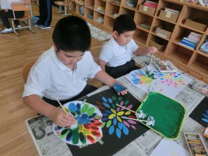 「おはなしの絵」の学習では,絵具を使った花火を描きました。授業のはじめに読んだ絵本の中から気に入った場面を選んで表現しました。筆を上手に使って花火を表したり,型を使って上からタンポでトントンと色を付けたり,一人ひとり素敵な作品をつくることができました。
