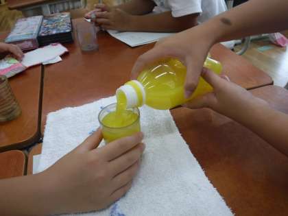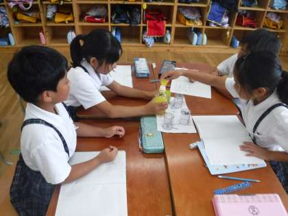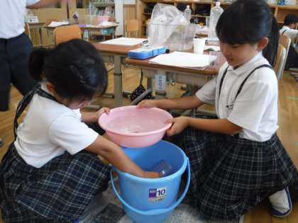 先日学習したかさの学習では,色水を使いながら