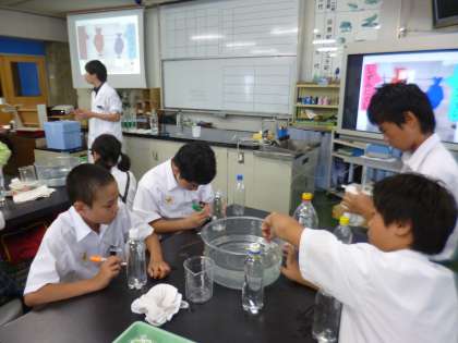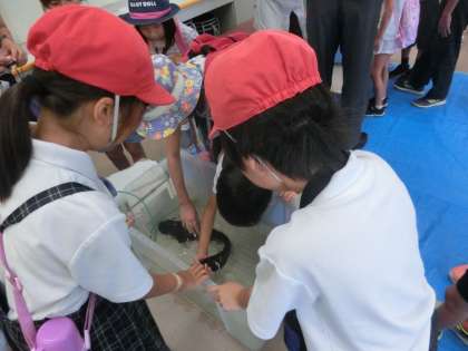 初めは,生き物コーナーへ行きました。ナマズやイモリ,ドクターフィッシュに触れたりザリガニ釣りを体験したりしました。はじめは怖がっていた人も,近づいて見る中で「かわいい〜!」と親しみを感じていました。プラネタリウム学習では,月や星座について学習しました。月の動きや空いっぱいの星を眺めて興味津々の子どもたちでした。展示学習では自分からいろいろなものを興味をもって見たり,触れたりして活動することができました。また,4年生以上の児童は実験室学習がありました。今回の実験は「しずみっこ〜浮沈子をつくろう〜」です。所員さんのお話をよく聞いて作業をすすめ,見事,実験成功!ペットボトル内に浮かした魚が手の圧力で浮いたり沈んだりしました。