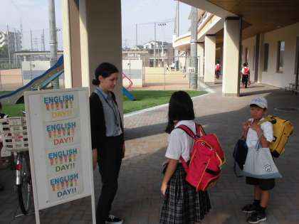 ALTのキャンディス先生が,東門で子どもたちを「Good Morning!How are you?」と声をかけて,子どもたちもそれに応えています。